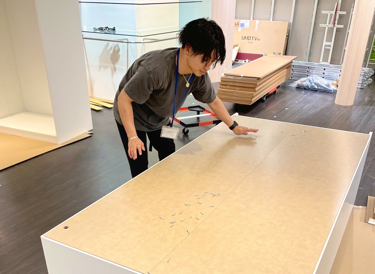 店舗設営作業では、何もない商業施設のブースに、棚(什器)を作って設置したり、壁紙を貼ったり、商品の搬入、陳列作業を行い、ストアをオープンできる状態に作り上げます。