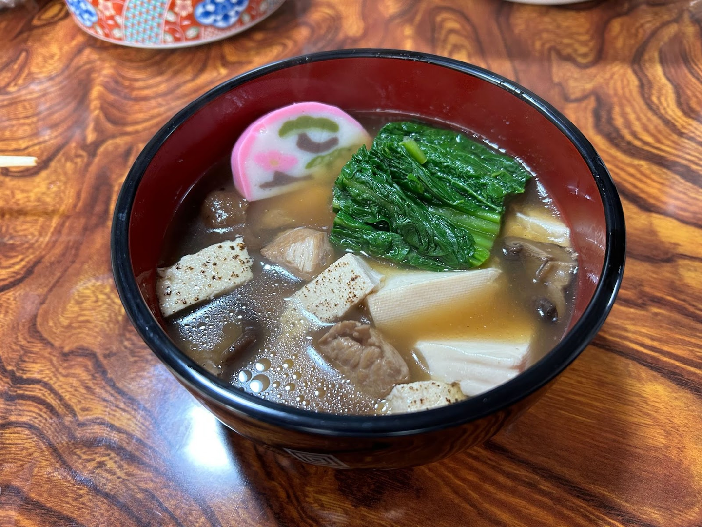 鶏ガラと昆布でとった出汁を使い、具材は鶏肉、ナルト、人参、うずらの卵が入っており、ゆず香るシンプルなお雑煮です。