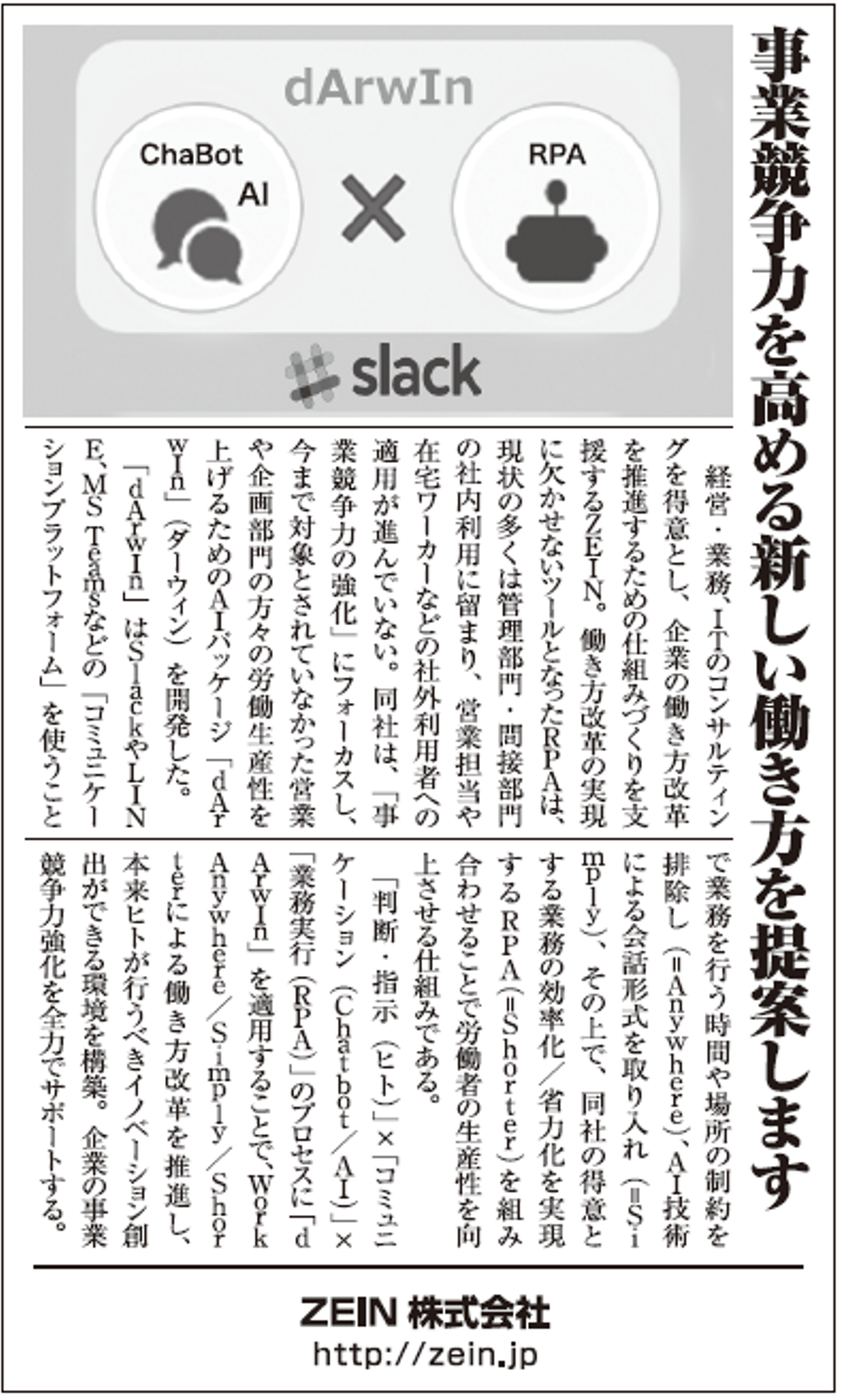 「dArwIn」は時間・場所の制約のない、SlackやLine、MS Teamsなどの「コミュニケーションプラットフォーム」を利用し、イノベーション基盤となるコミュニケーション基盤を用意するとともに、AIによる会話と、定型化された業務の効率化を実現する「RPA」を繋げることで、あらゆる業務の起点となる「会話」をそのままに作業を完結することができます。