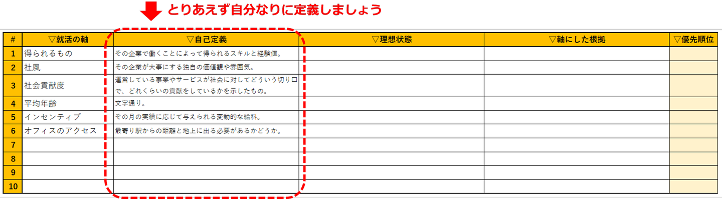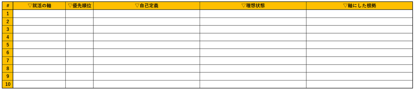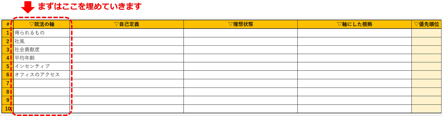 まずは、先ほど選んだ「就活の軸」をどんどん埋めていきます。