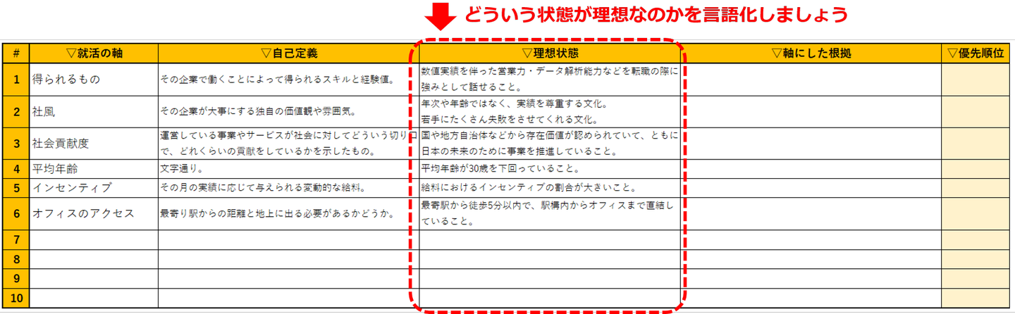 今まで「自己定義」と「理想状態」と「軸にした根拠」を書いてくるうちに、これらの6つの中でも「やっぱりこっちの方が大事だな~」や「これはちょっと優先順位下げてもよさそうだな…」というのが見つかってきたかと思います。