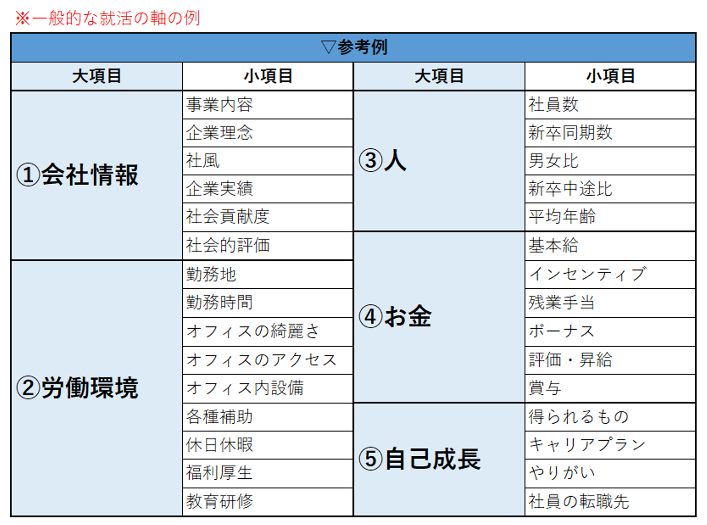 大きく分けると、上記の「会社情報」「労働環境」「人」「お金」「自己成長」の5つでしょうか。