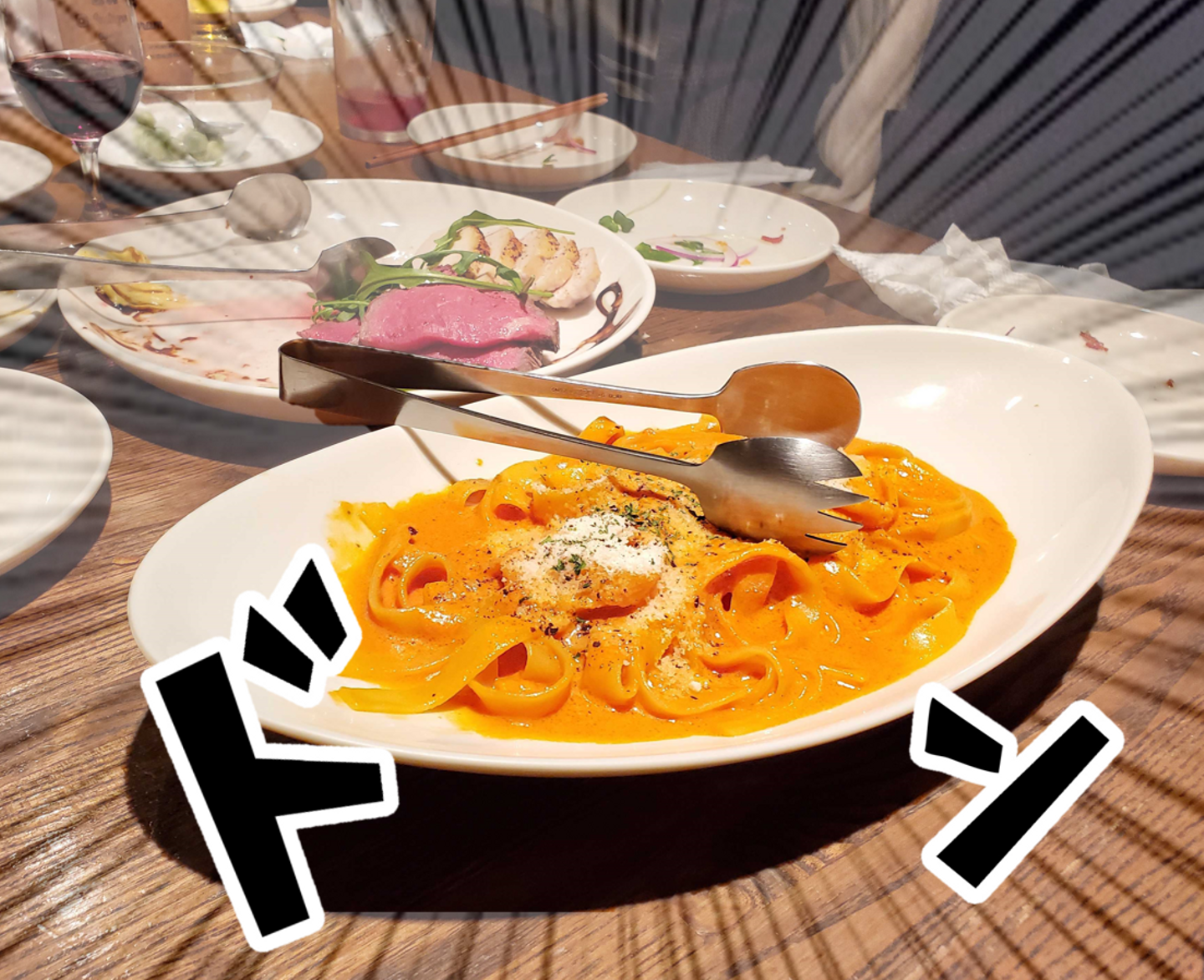 ほっぺたが落ちている女性とともにローストビーフに舌鼓を打ちつつ、「そろそろパスタのテンションじゃね?」とノストラダムスもビックリな未来予知をしていたところ、案の定パスタが運ばれてきました。