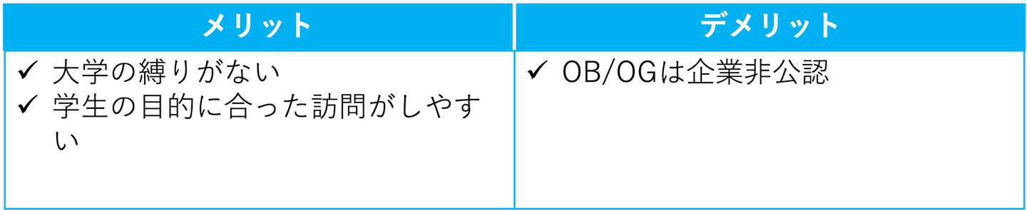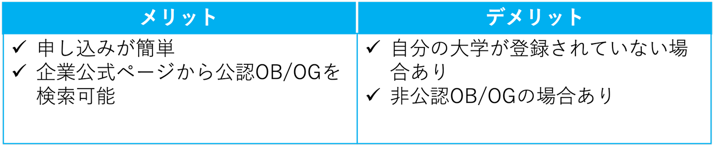 メリットは、簡単にOB/OG訪問を申し込むことができる点、企業公認のOB/OG訪問が可能な点の二つです。
