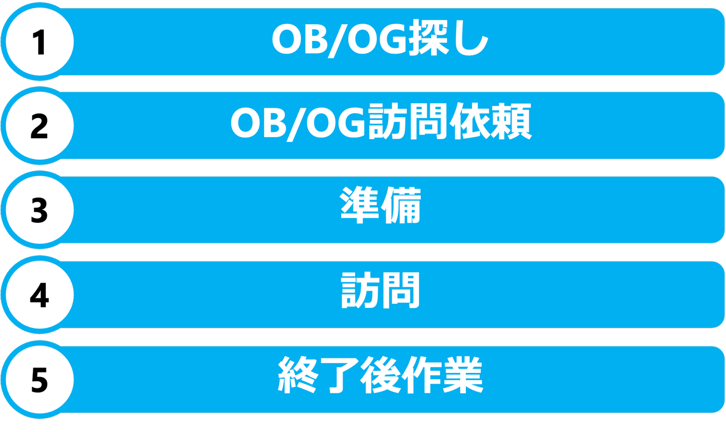こちらは、最も環境による差が生じやすい段階です。例えば、サークルや部活動、ゼミのように、先輩との繋がりが強いコミュニティに所属している場合は、比較的探しやすいです。しかし、そのような縦の繋がりが強いコミュニティに所属していない場合や、所属していても自分が興味を持っている企業で働くOB/OGと繋がることができない場合は、困難です。