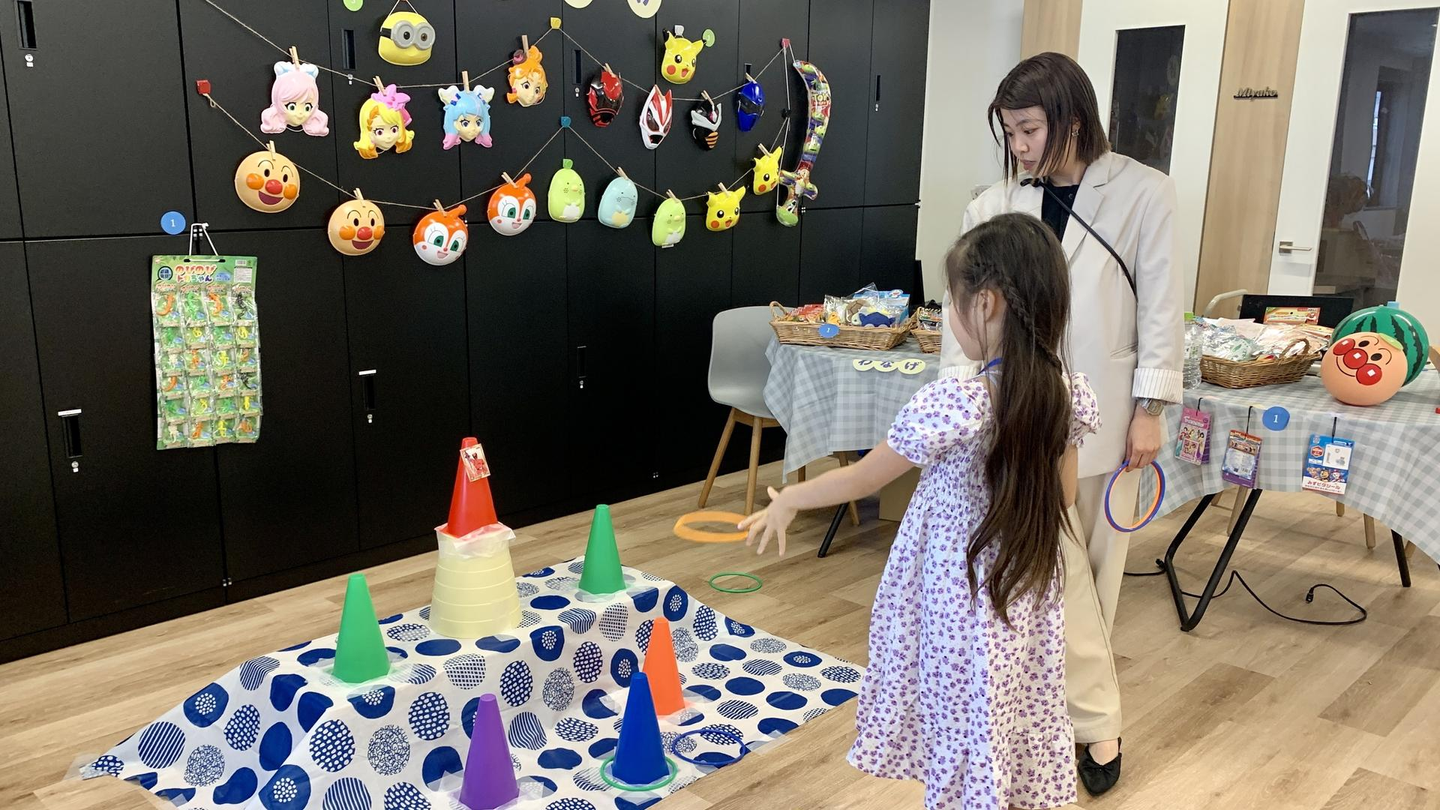 わなげを楽しむお子さんと社員さんの様子です!景品には、たくさんの種類のおもちゃが用意されていました!