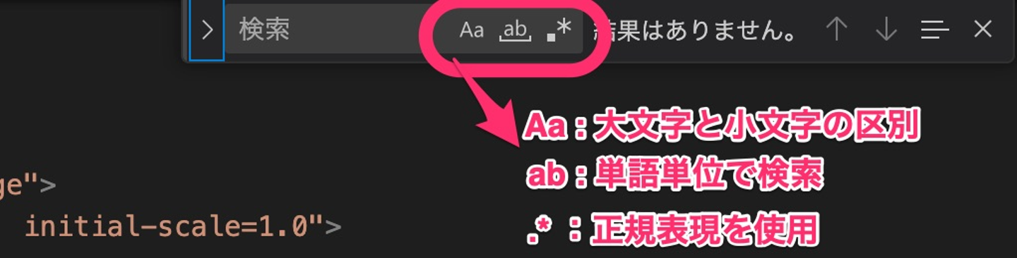 検索のショートカットキーは他のアプリとも同じですが、検索ボックスの右側の「Aa」などの箇所をクリックすると条件を指定して検索が可能になっています。