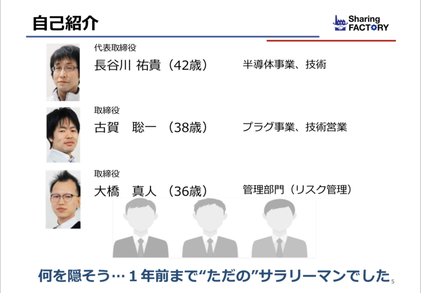 お堅い部門名が書かれていますが、いわゆる大手企業で半導体の技術畑にいた人間や自動車プラグの技術営業を行なっていた人間、わたしに至っては管理部門にいた人間です。そういったサラリーマンが一念発起しやっています。