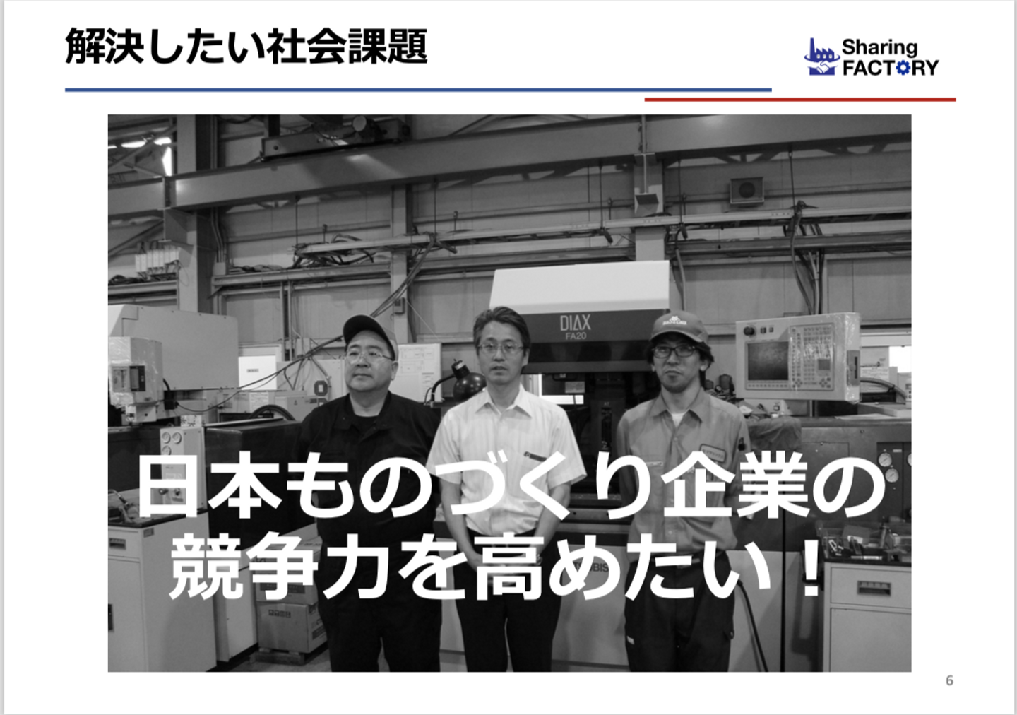わたしたちはいわゆる製造業の人間ですので、解決したい課題は日本のものづくり企業の競争力を高めたい、と思っています。世界に誇れる日本の製造業ですが、海外勢の台頭にやられていて「良いモノを持っていること」と「良い技を持っていること」をもっとうまく生かしていきたいと、製造業に携わる人間として思っています。