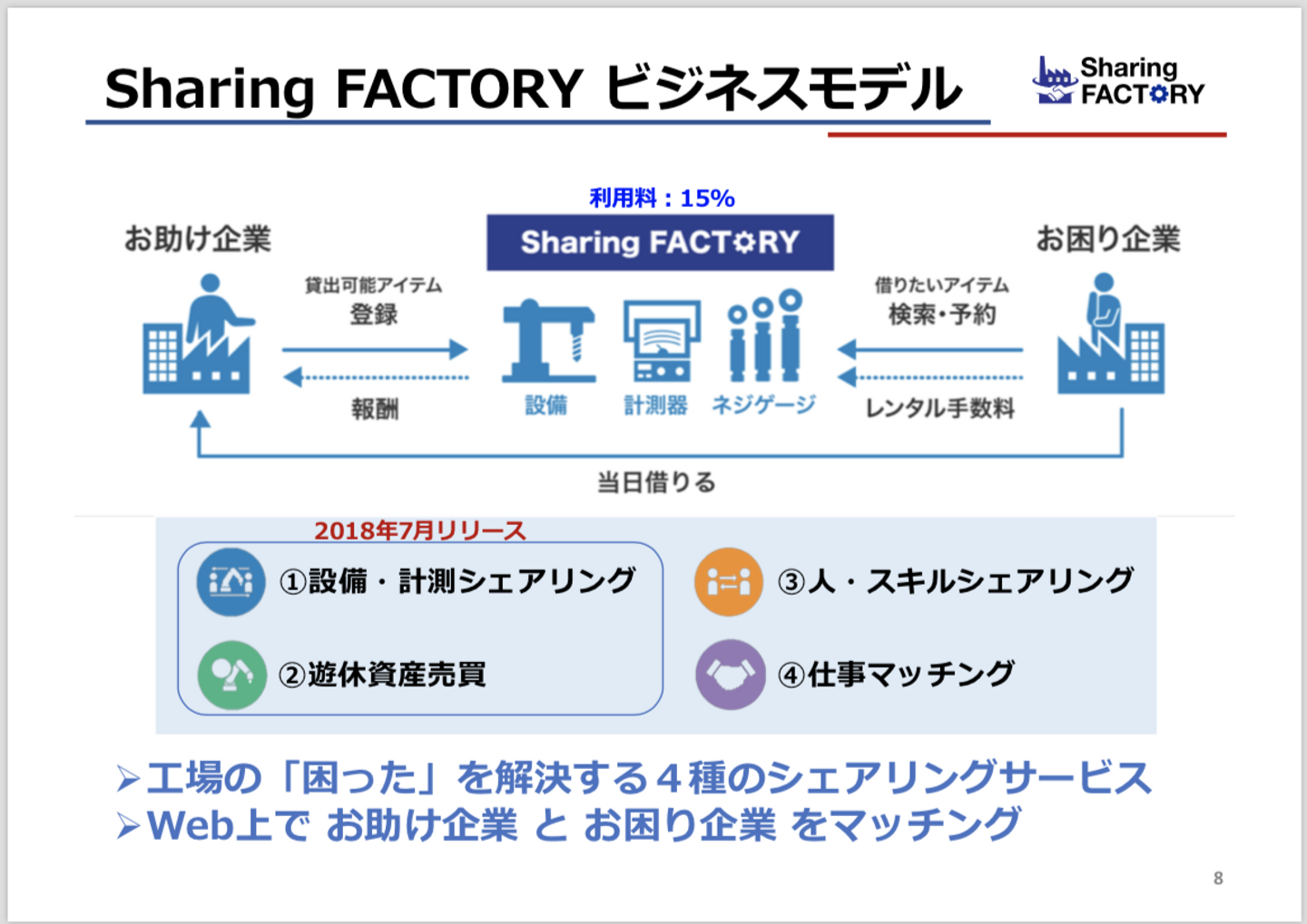 空いている機械をシェアして収益をアップしようという設備継続や、工場で使わなくなった有給資産を活用しようなどといった『メルカリの工場版』のようなイメージです。