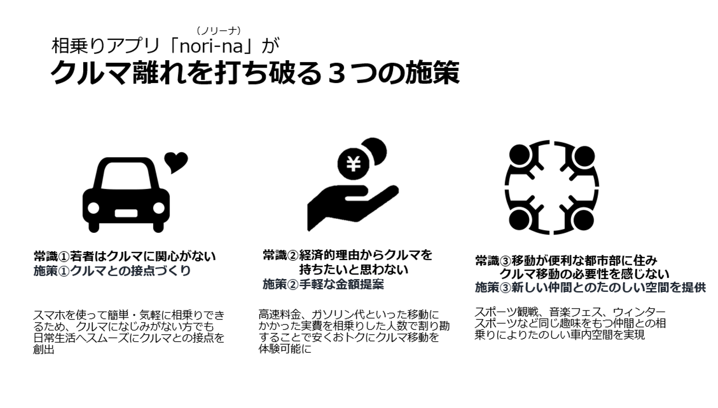ちなみにZERO TOONEの運営するノリーナも、カープール(相乗り)型のライドシェアアプリです。2018年4月に、経済産業省グレーゾーン解消制度を活用し、割り勘であれば白タクに当たらないという回答を受けました。該当プレスリリー:割り勘であれば「白タク」行為にあたらない 相乗りアプリ「ノリーナ」が「グレーゾーン解消制度」活用 経産省を通じて規制を所管する国交省に照会