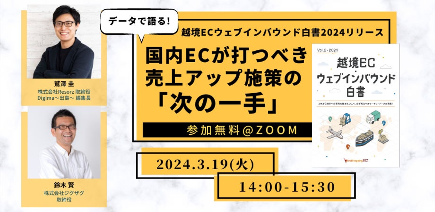 WorldShopping BIZを提供する株式会社ジグザグ(本社:東京都渋谷区、代表取締役:仲里一義)は、海外ビジネス支援プラットフォーム「Digima~出島~」等を運営する株式会社Resorz(本社:東京都新宿区、代表取締役 兒嶋裕貴)と、「越境EC・ウェブインバウンド®白書2024」のホワイトペーパーを無償公開いたしました。また、公開を記念して3月19日(火)14時よりリリース記念セミナーを開催いたします。