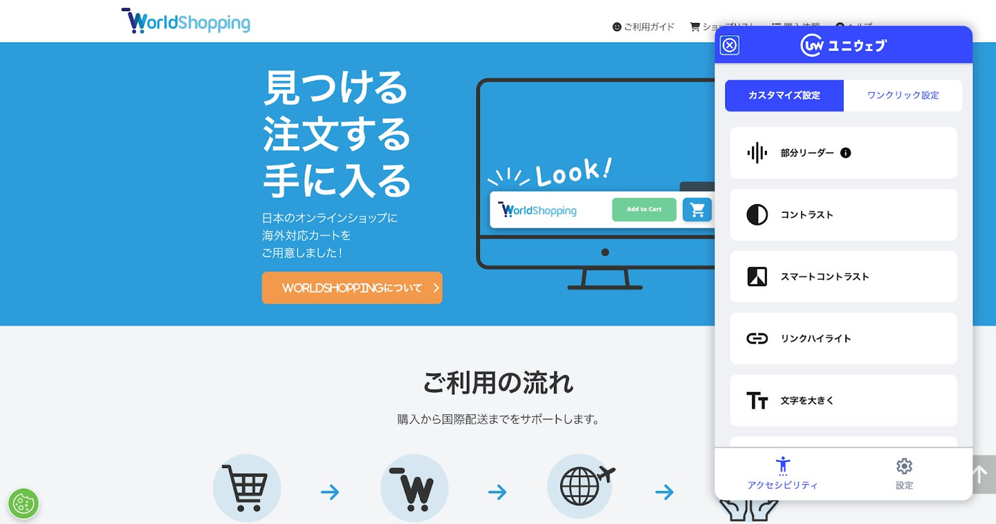 アイコンをクリックすると、アクセシビリティメニューが表示され、文字を読み上げてくれる部分リーダーや画面のコントラスト切り替えなどがボタン1つで可能です。