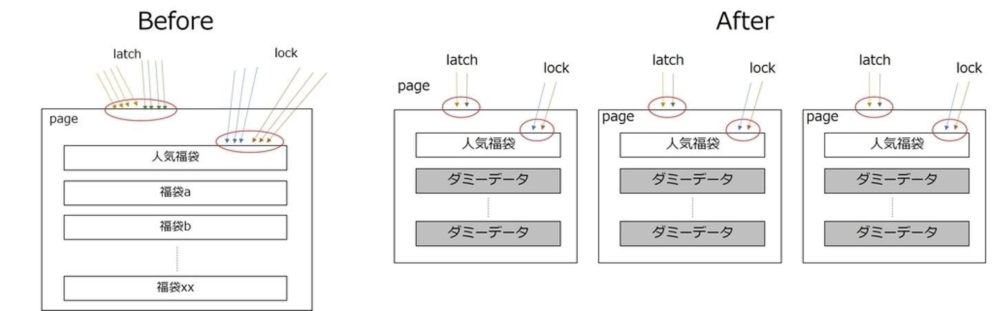 しかし、加熱商品の発売イベントでは、特定の人気商品に対して在庫更新クエリが集中します。このような状況下では大量の「行ロック」および「ページラッチ」競合が発生し、クエリの実行時間の大幅な遅延やクエリタイムアウトエラー多発に繋がってしまいます。ワーストケースでは、クエリの遅延によりワーカースレッドが枯渇して、カートDB全体のスループットが著しく下がるという障害が発生することもあります。