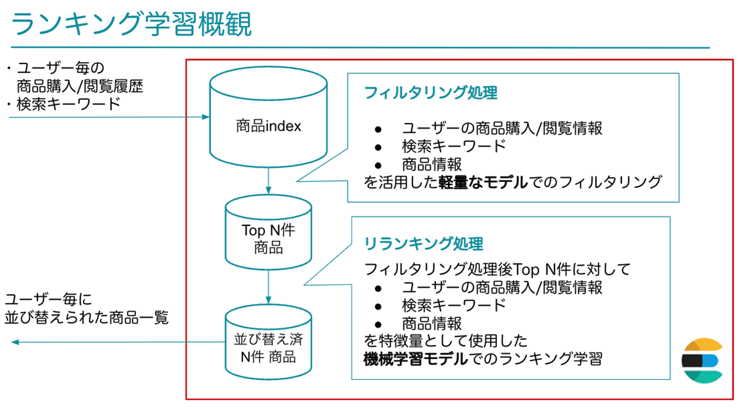 フィルタリングされた全商品に対してランキング学習を走らせるのではなく、フィルタリング時のElasticsearchのスコア結果トップN件に絞ってリランキング処理を行います。リランキング処理でのランキング学習では、ElasticsearchのLearning to Rankプラグインを使用しています。詳しくはElasticsearch Learning to Rankプラグインの使い方とポイントをご覧ください。