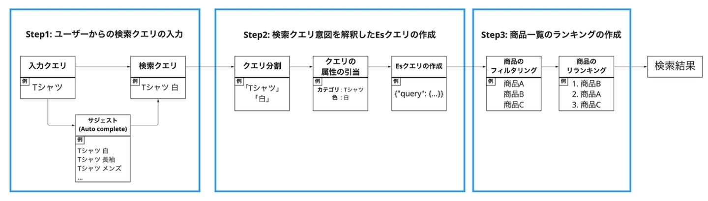 ZOZOTOWN検索では、ユーザーが検索クエリを入力してから検索結果を出力するまで大きく3つのステップに分けられます。