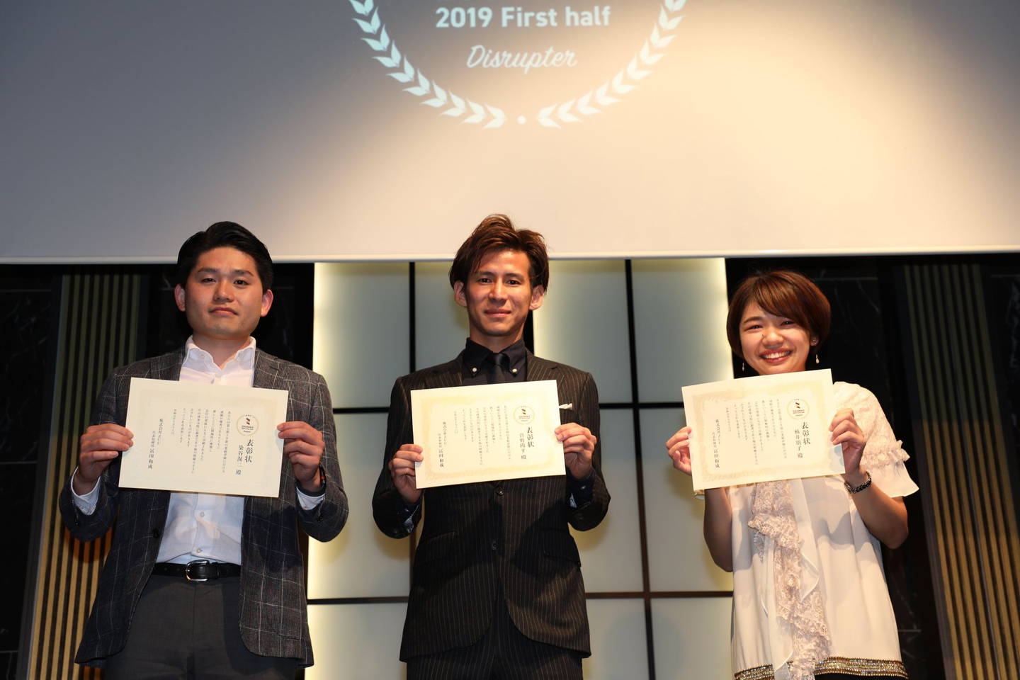 司会より受賞者の名前が呼ばれると歓声がわきおこり、受賞者はステージに上がり代表冨田から表彰状が授与されました。