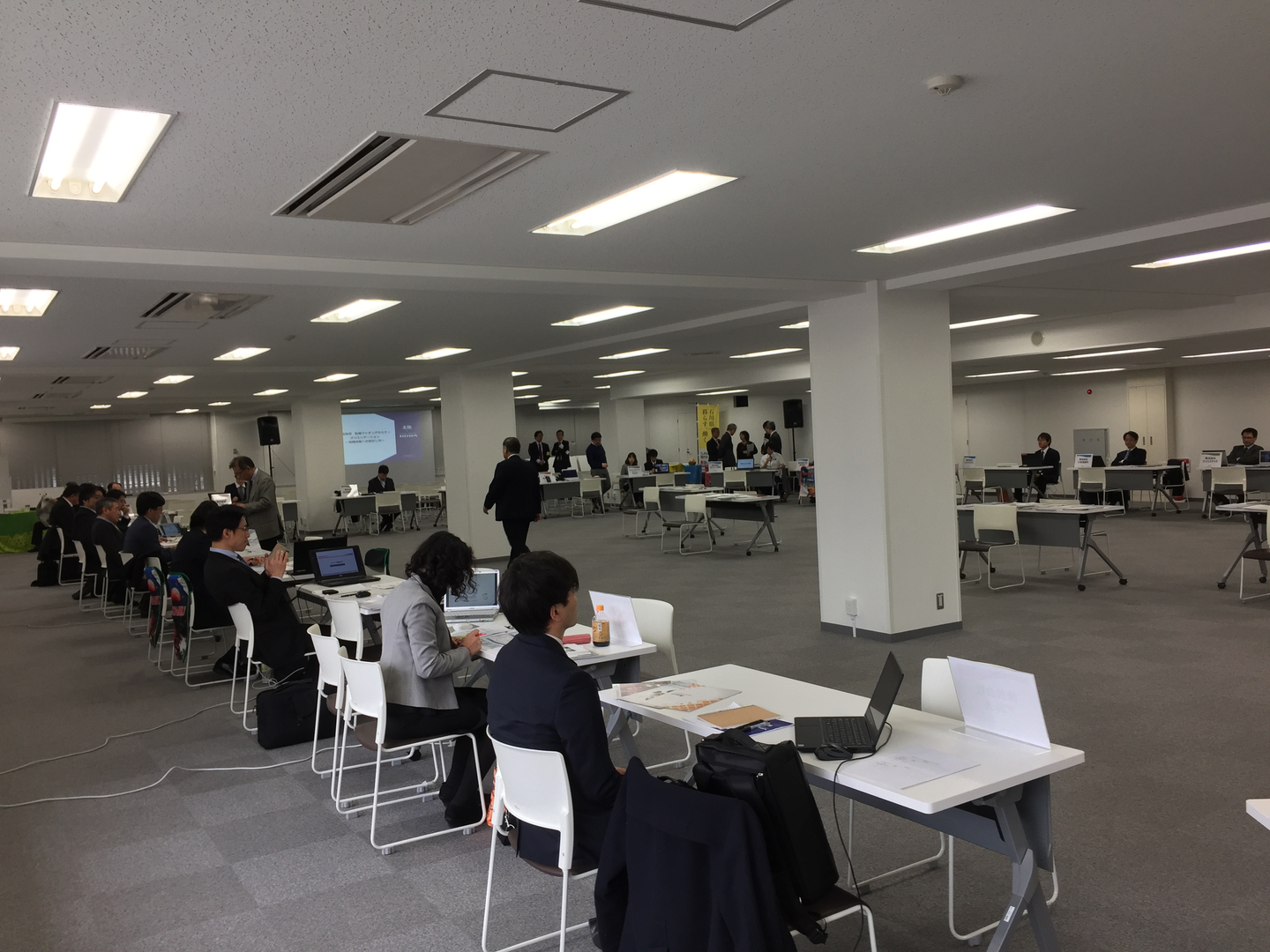さて、本イベントですが、上のような広いフロアに参加企業がぐるっと周りを取り囲むように配置されており、転職希望者が興味のある企業のところに話を聞きに行くというスタイルです。近年、タブレットが益々便利になってきており、こういったイベントで、どこの企業もタブレットをうまく活用しているのかなと想像していたのですが、意外と使われているところは少なく、従来通りの紙の資料とノートPCというところがほとんどでした。(ちなみに、ジークスはタブレット2台体制でばっちりスタンバイ。)