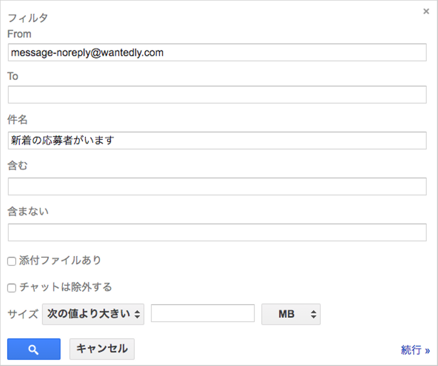 Wantedly から届く「新着の応募があります」という件名とメールアドレスを抽出条件にしたフィルタを作成し、転送先設定にさきほど発行されたチャンネル専用のメールアドレスを設定します。