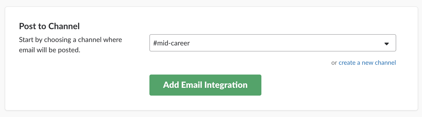 通知を送るチャンネルを選択(今回は既存の採用チャンネル #mid-career を選択)して「Add Email Integration」をクリックします。