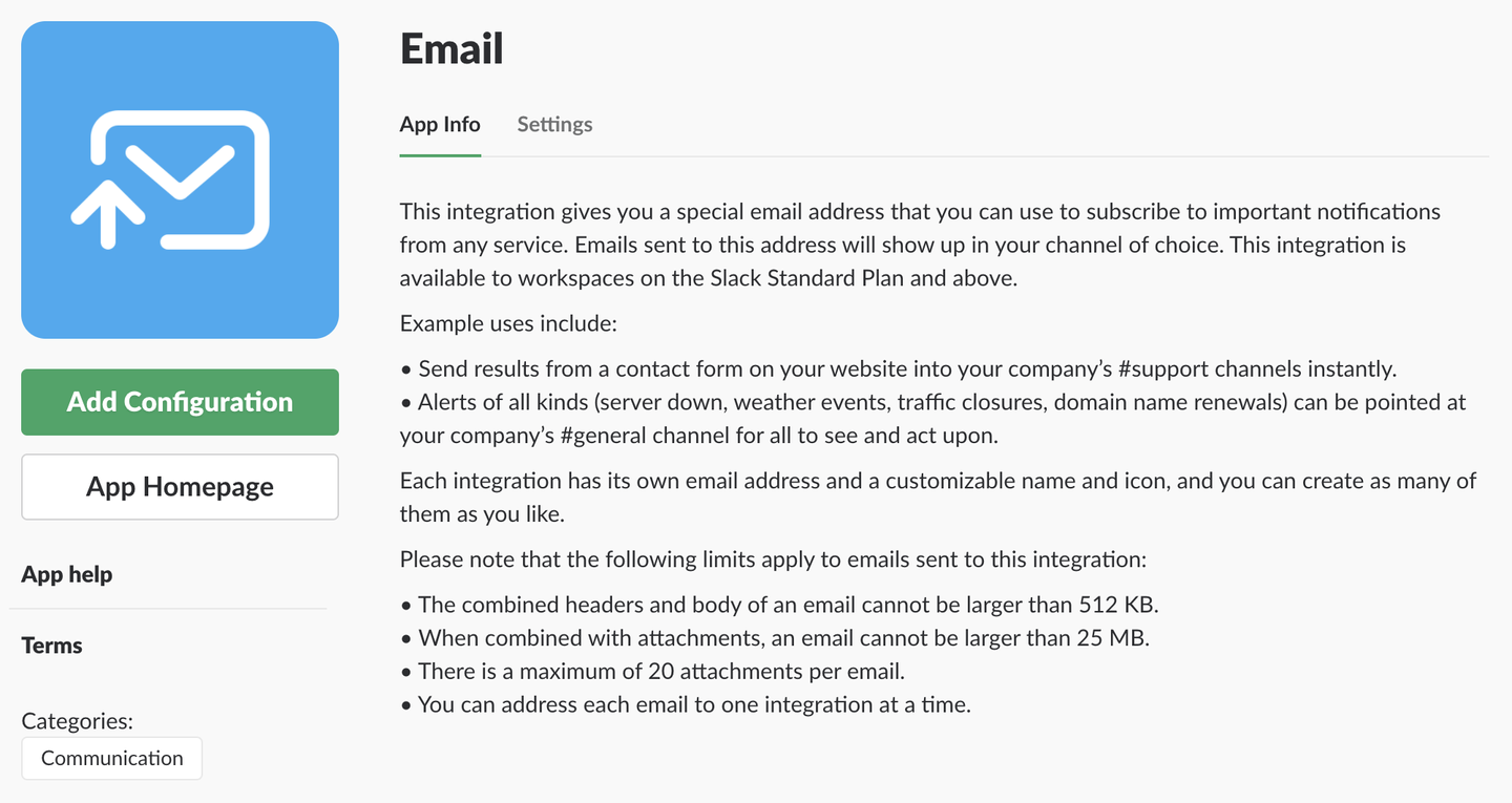 メールで Slack に投稿できるようで、このケースにピッタリのアプリが見つかりました。
