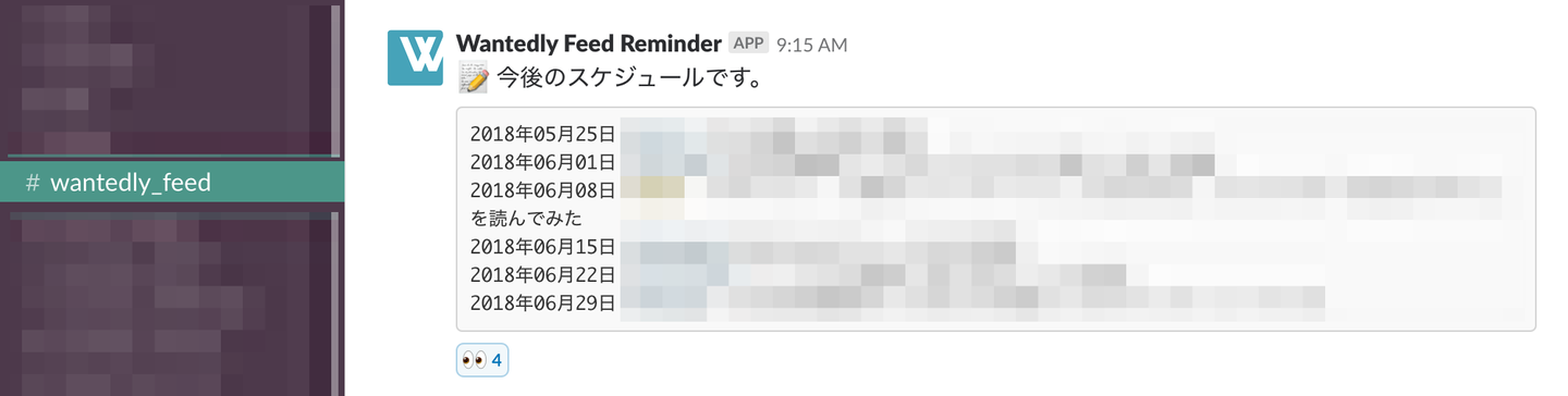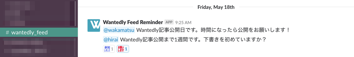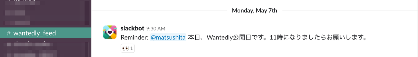/remind #対象チャンネル @対象ユーザー 本日、Wantedly公開日です。11時になりましたらお願いします。 at 09:30 on May 7ただ、この方法だとスケジュールを立てた時や変更があった時に、都度Slackコマンドを入力しなくてはいけないので、かなり手間です。