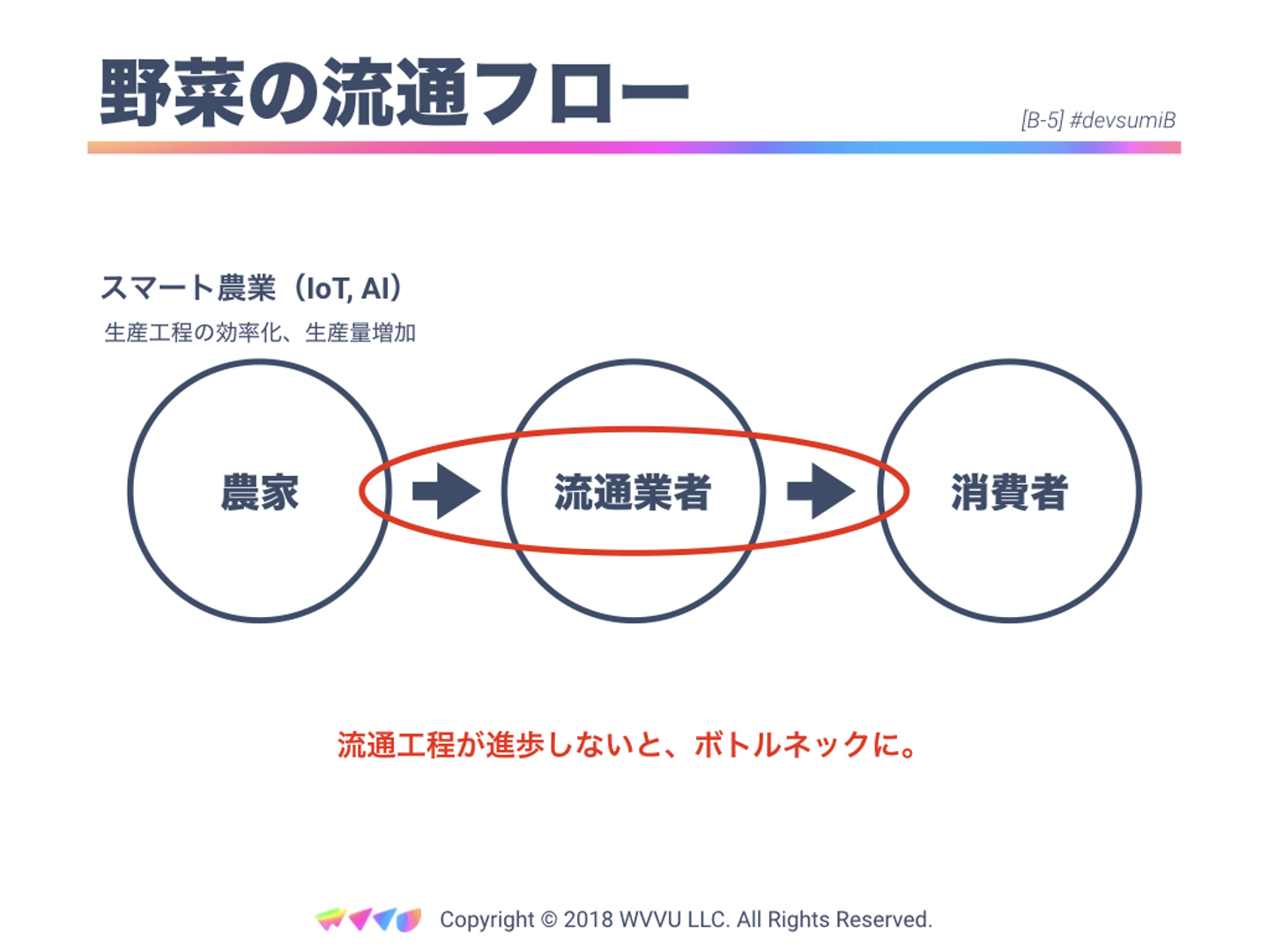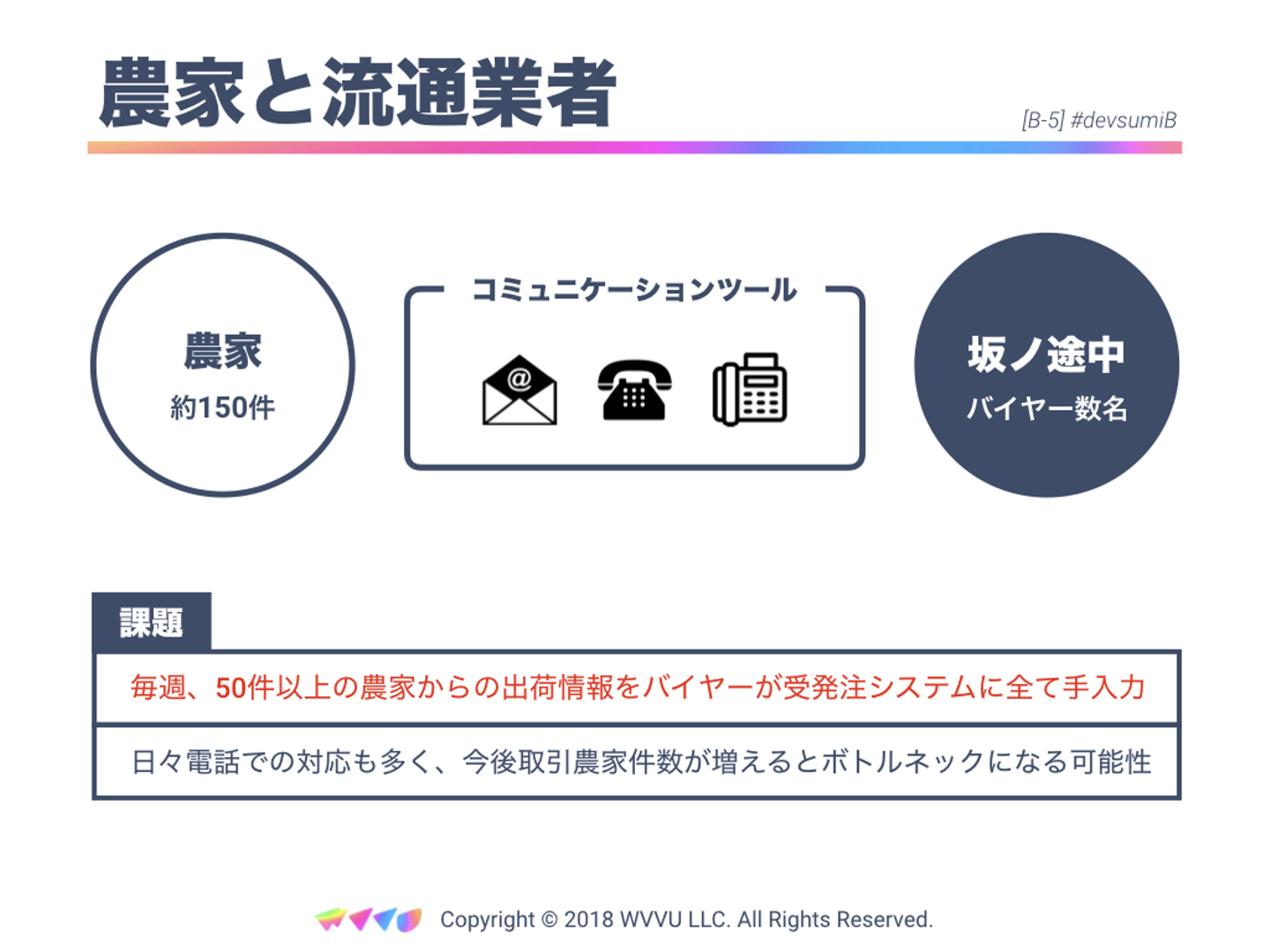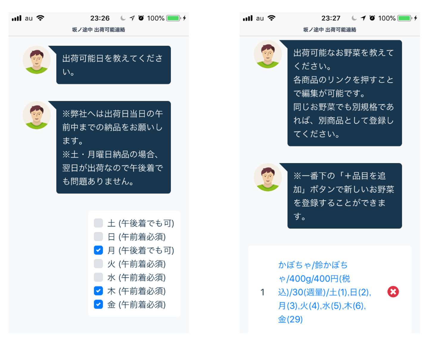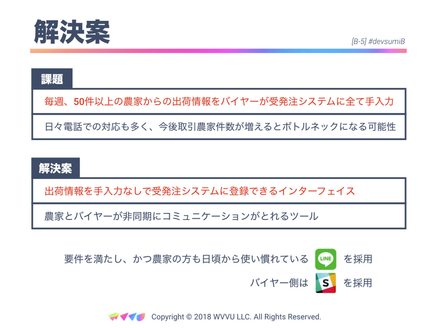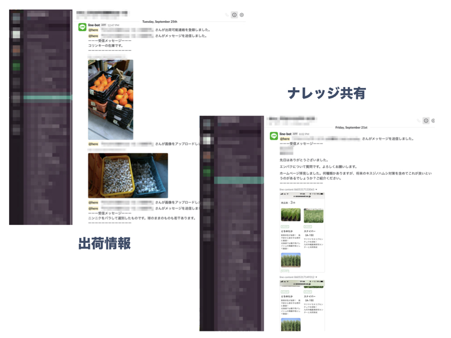 ソリューションとしては、農家さんには日頃から使い慣れている「LINE」とバイヤー側は業務で使っている「Slack」を繋げてコミュニケーションをとる+「Bot」で出荷情報を登録してもらうように進めました。