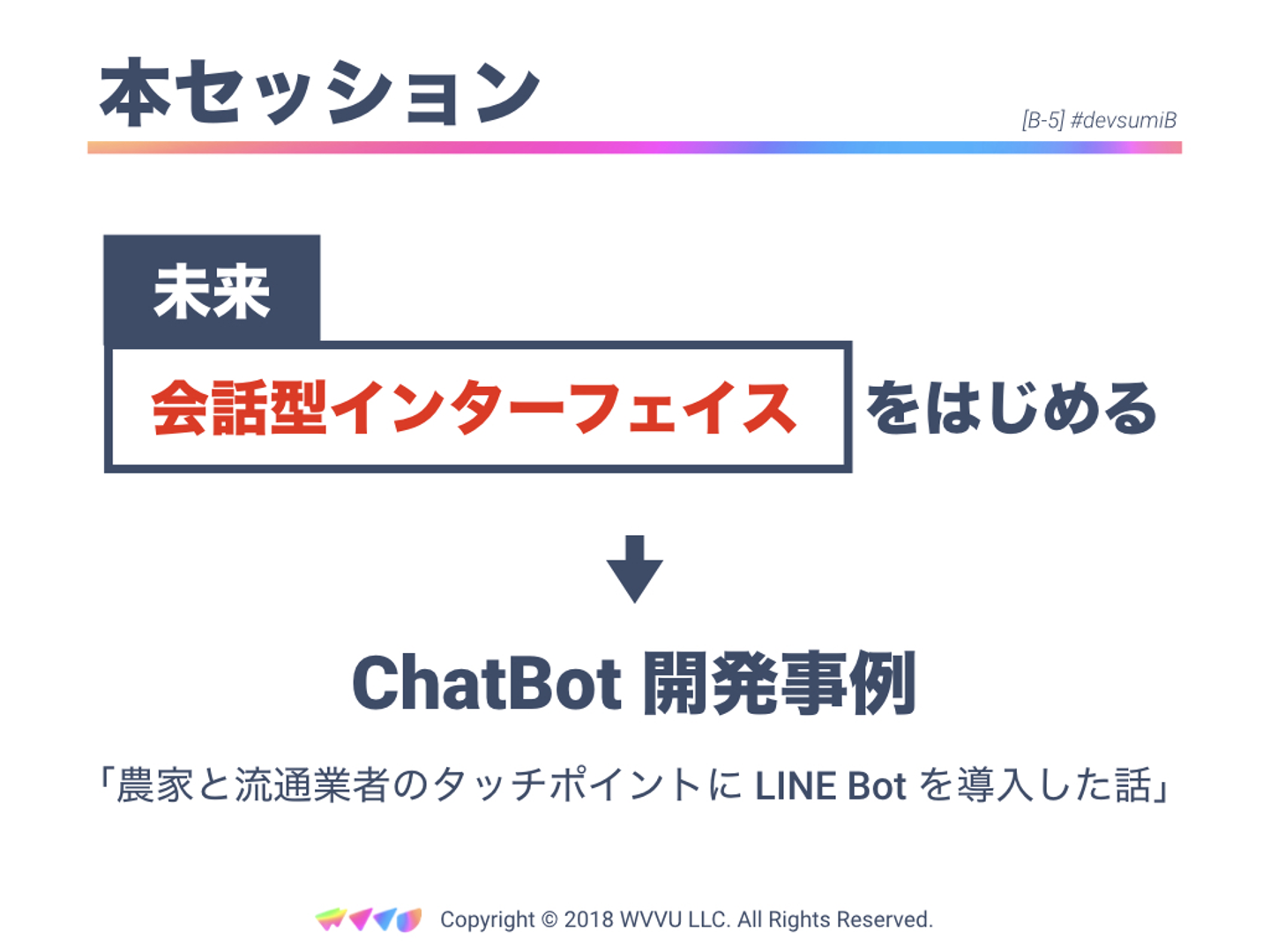というわけで、今回のセッションでは僕が思う未来「会話型インターフェイス」をはじめるというテーマで、「ChatBotの導入事例」の話をさせてもらいました。