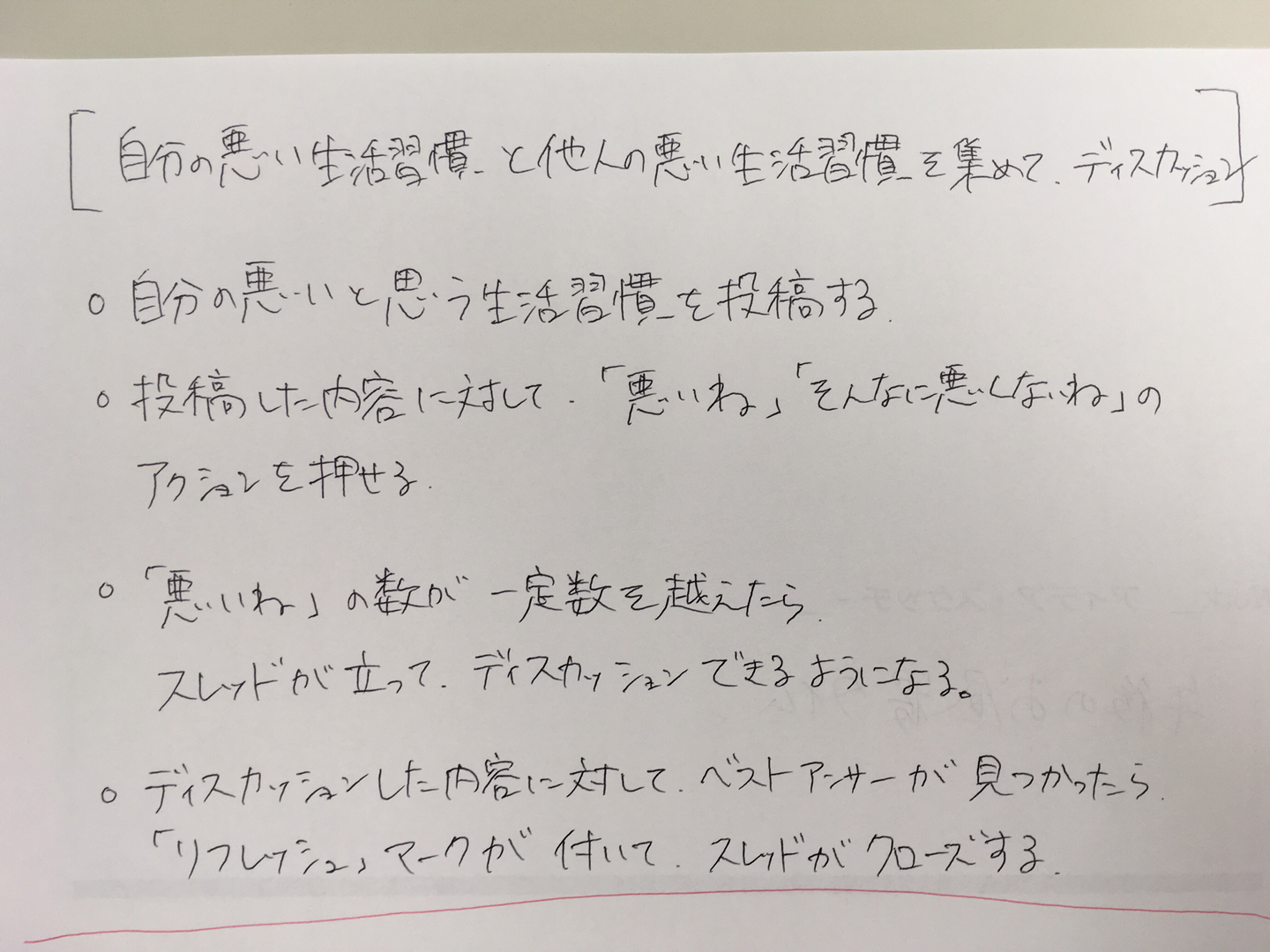 - 自分・他人の悪い生活習慣を集めて、解決のためにディスカッションする