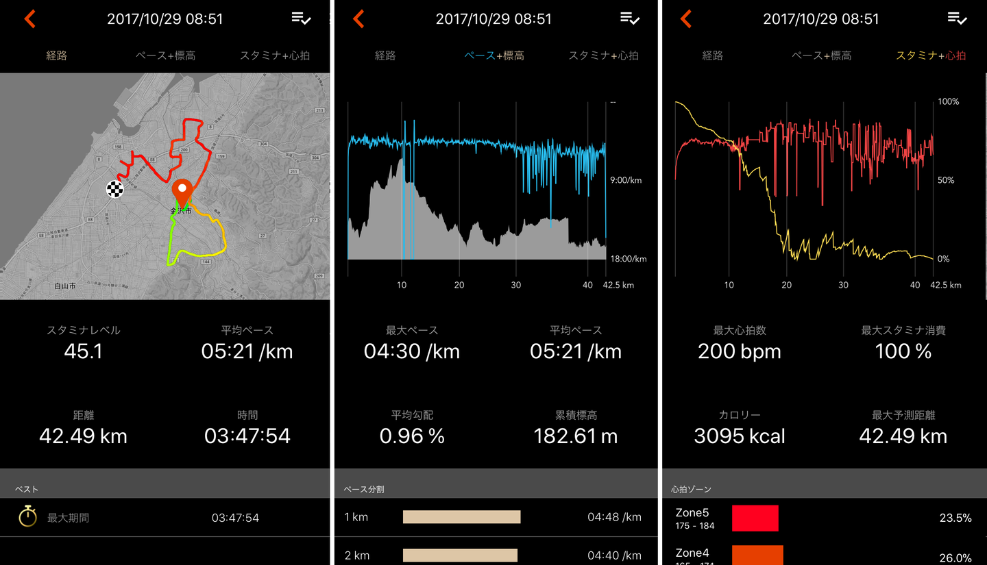 今回のランの「GoMore」で記録された結果を見てみると、なんとスタミナ100%使い切っていました。普段10kmとか走っても20〜30%程の消費で、なかなかここまでスタミナが減ったりしないので「おーさすがに消費したなー!」と思いました。気持ちよく走れていると感じていた20km手前あたりでスタミナが急激に消費されており、実は下り坂で足を使いすぎていて、後半落ちてしまったのかもしれません。