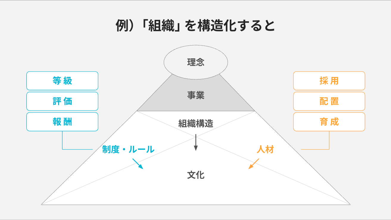 例えば、「組織」というものを構造化してみましょう。組織構造、制度・ルール、人材、そしてそこから生まれる文化など、さまざまな要素に分解できます。このように、「組織」という漠然としたものでも要素に分解していくことができます。