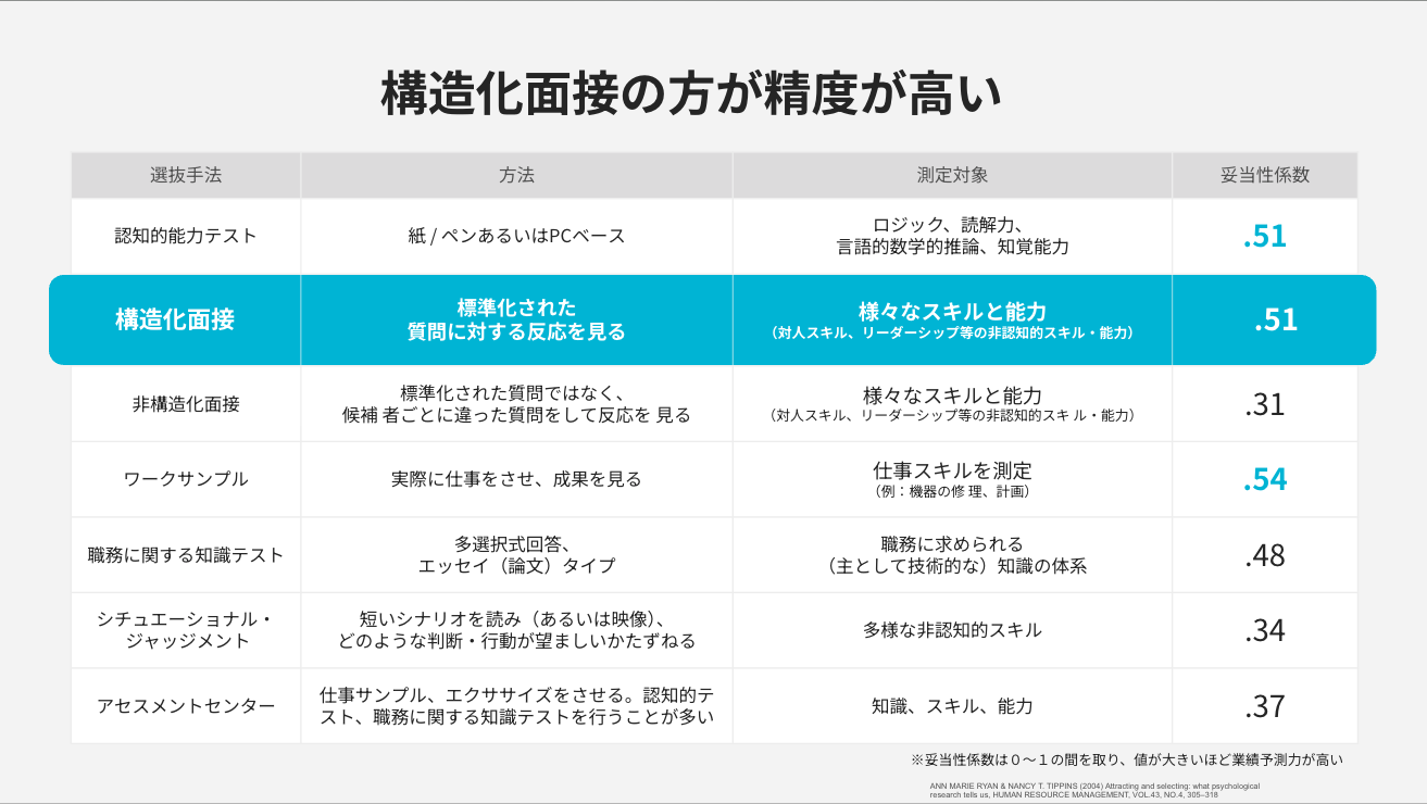 様々な選抜手法の妥当性(入社後のパフォーマンスとの相関)を測ったデータでは、ワークサンプル(実際に仕事をさせ、成果を見る)に次いで、「構造化面接は精度が高い」と示されています。