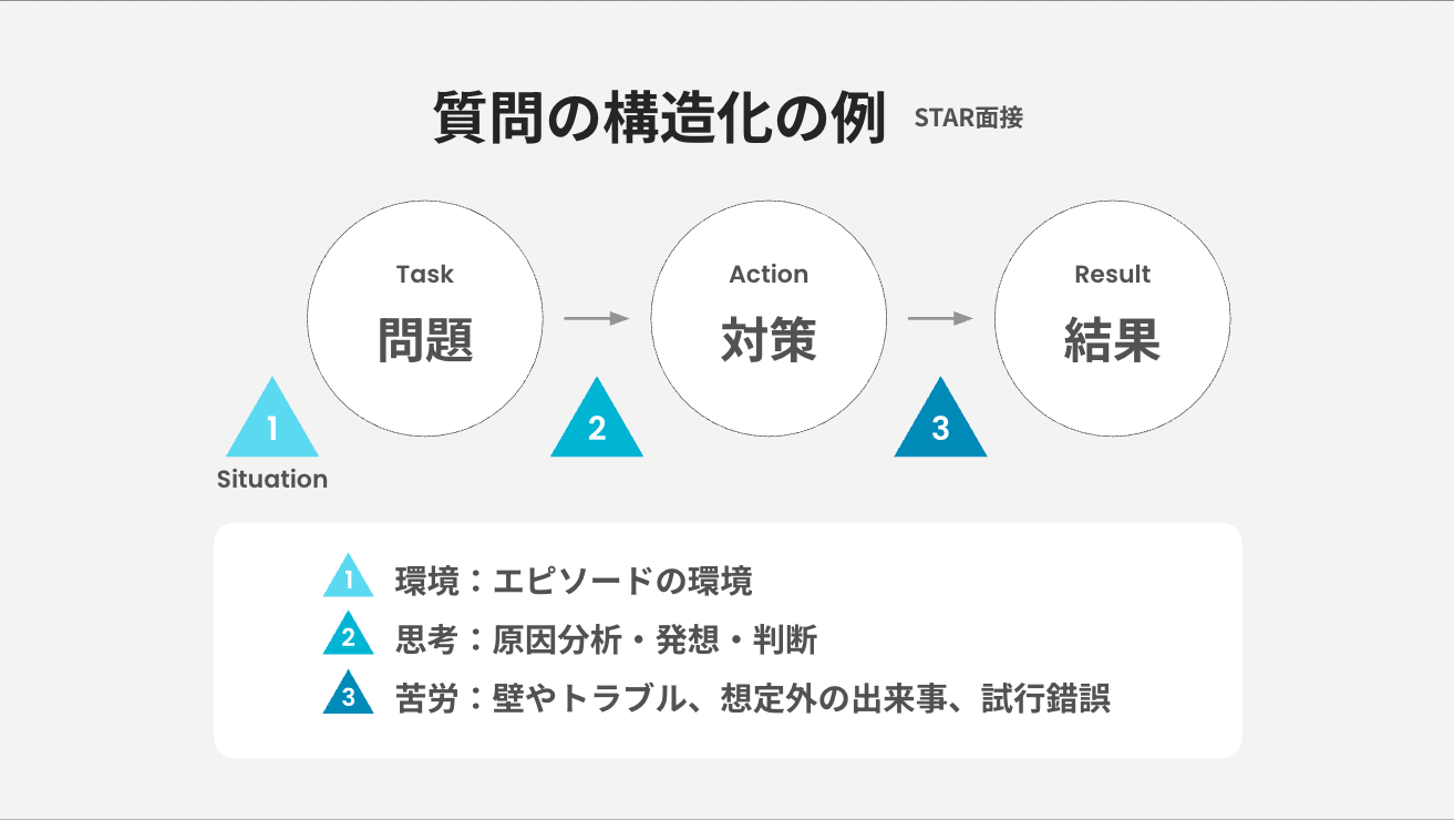 次に「質問の構造化」です。これには「STAR(スター)面接」というフレームワークが役立ちます。