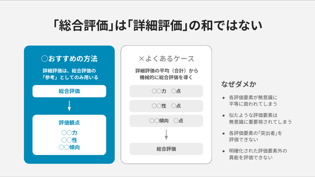 よくある間違いが、詳細な評価項目の平均点を機械的に総合評価としてしまうこと。私はこれはやめた方がいいと思っています。おすすめは、詳細評価を、総合評価の妥当性を確認するためのチェックリストとして使うことです。まず感覚で総合評価をつけた後、「本当にこの評価で正しいか?」を詳細項目と照らし合わせて検証するのです。
