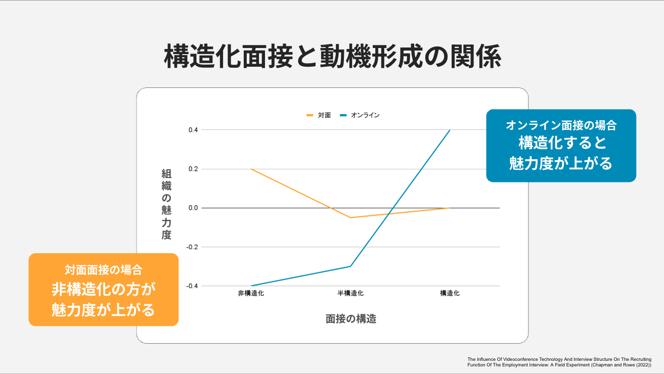 さらに面白い研究データがあります。候補者の動機形成、つまり「この会社で働きたい」という気持ちにどう影響するかを調べたものです。対面面接ではフリートークの方が動機形成が高い傾向にありますが、オンライン面接では逆に、構造化面接の方が、フリートークより動機形成が格段に高まるという結果が出ています。