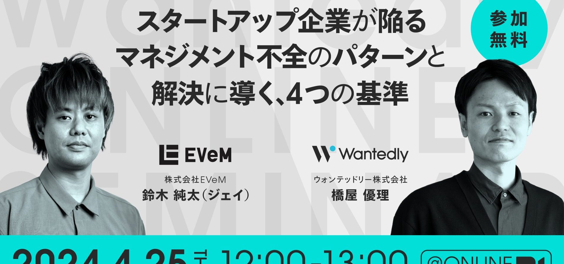 2024年4月25日に、「スタートアップ企業が陥るマネジメント不全のパターンと解決に導く、4つの基準」についてのウェビナーが開催されました。このイベントでは、株式会社EVeMの鈴木純也(ジェイ)氏とWantedly株式会社の橋屋優理氏が登壇し、それぞれ「急成長期に訪れる、マネジメント不全の再現性」と「知っておけばよかったマネジメントにおける「4つの基準」」をテーマに行われました。