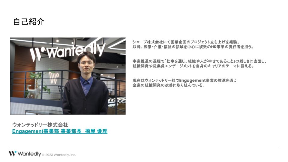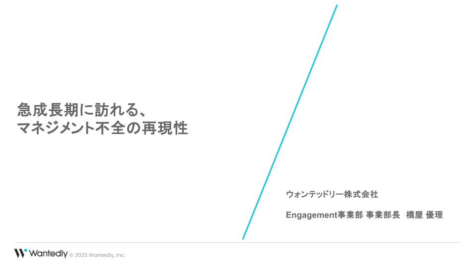 こんにちは、Wantedlyでエンゲージメント領域の事業責任者を務めております、橋屋優理です。本日は、スタートアップ企業が陥るマネジメント不全のパターンとその解決策についてお話しできることを楽しみにしています。まずは、私の経験や背景について少しお話しさせていただきます。