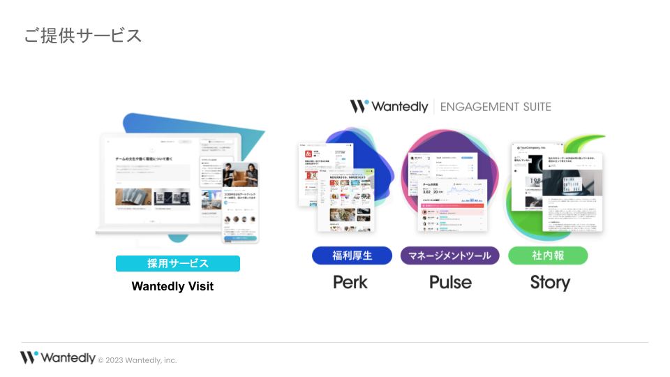 たくさんのご質問や感想をいただき、セミナーは好評でした。これからも、皆様のマネジメントにおける課題解決に役立つ情報を提供できるよう努めてまいります。Wantedlyでは、そんな組織課題に寄り添うサービスとして採用のVisit、Engagement Suite(Perk、Story、Pulse)を提供しています。