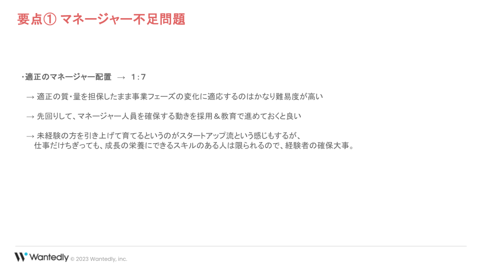 要点を簡単にお伝えすると、まず適正なマネージャー配置は大体1対7くらいが良いとされています。認知限界がそのくらいと言われているので、これを超えるとかなりしんどくなります。ですから、10人を超えるような組織になったら、マネージャーの目が行き届いているかを考える必要があります。例えば、50人の組織にしたいなら、マネージャーが7人くらいいるかを考える必要があるということです。