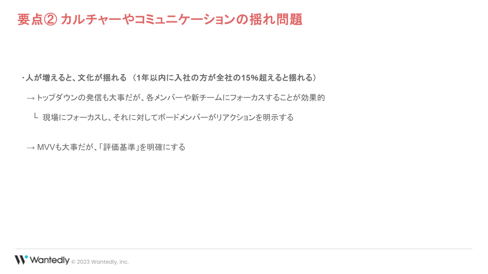 もう一つ言えるのが、組織が成長する中で、カルチャーやコミュニケーションの揺れという問題についてです。特に、1年以内に入社した人が全体の15%を超えると、組織が変わる要素があると定量的に言われています。例えば、100人の会社で15人が新しく入ると、組織の雰囲気が変わることがあります。人数が少ない会社では、30人の組織で2人入るだけで15%を超えてしまいます。だから、新しい人が入ってくるたびに、文化が揺れないようにしっかりとした基盤を作る必要があります。