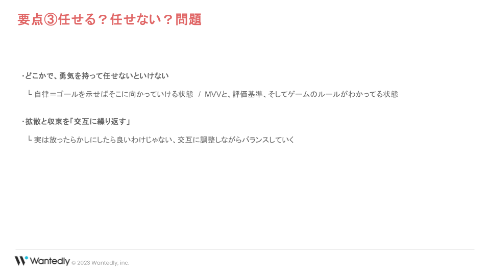 全体を通してお伝えしたいのは、拡散と収束を交互に繰り返すことが大切なんだということです。「自律」という言葉が評価されすぎて、委ねることが100%正しいという風潮もありますが、やっぱりバランスを持つことも大事なんですね。