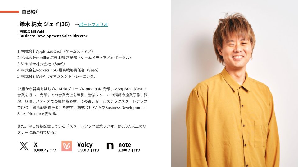 まず簡単に自己紹介させてください。鈴木と申しまして、ジェイというあだなで呼ばれています。今はマネジメントトレーニングを提供している株式会社EVeMで、ビジネスデベロップメントセールスチームというところでセールスを担当しています。