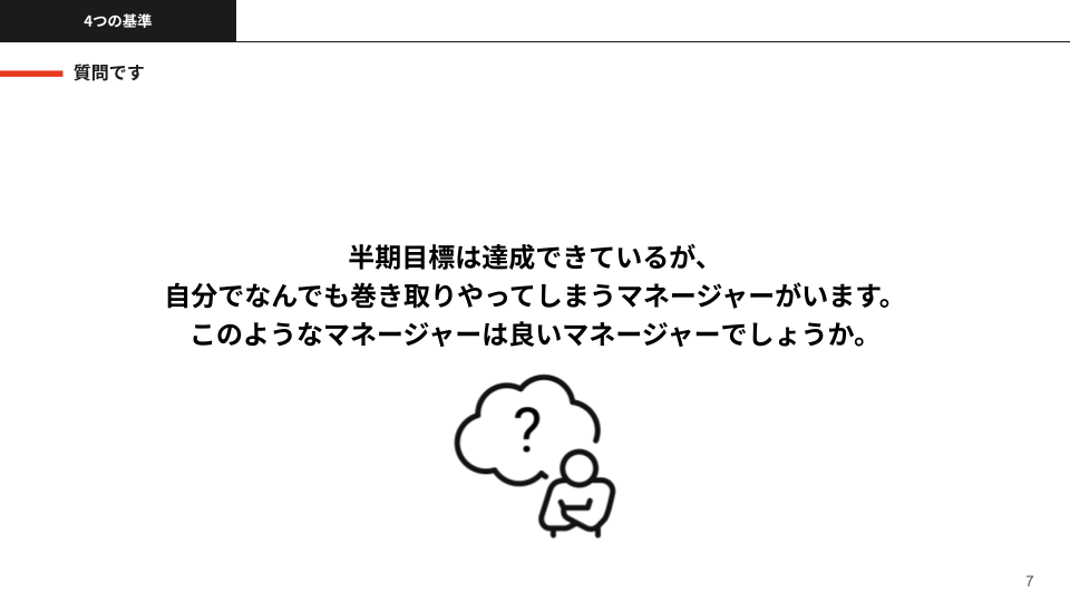 せっかくなので、皆さんにも次の質問について考えてみてほしいと思います。「半期目標は達成しているけど、自分で何でも巻き取ってしまうマネージャーは良いマネージャーでしょうか?」という問いです。