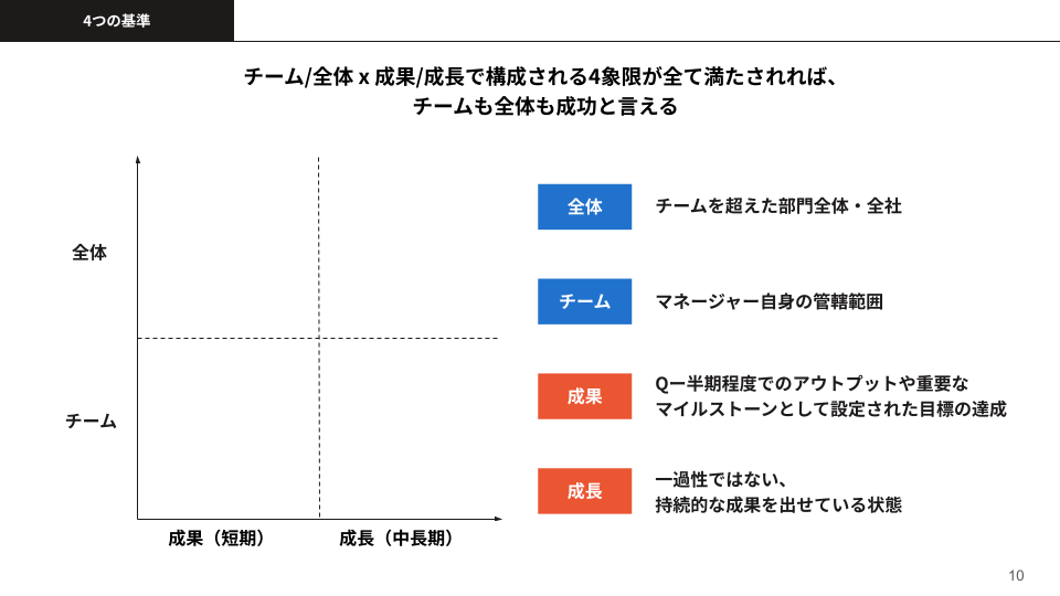 この4つの基準について、このような整理ができるんじゃないかなというのが、以下の図です。縦軸が会社全体、つまり自分のチームの広がりで、横軸が時間軸になっています。ここでは、短期の成果と中長期的な成長でざっくりと分けています。