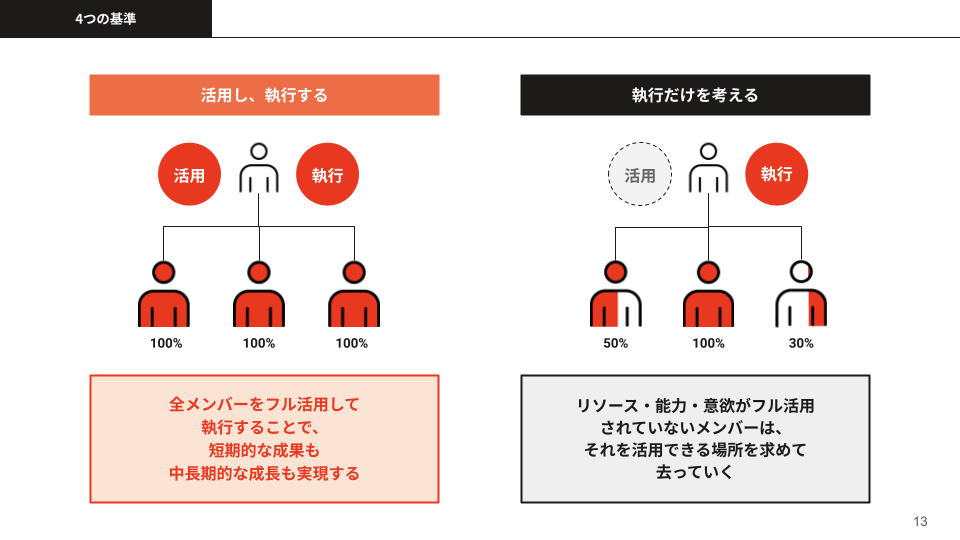 ただし、「活用」していないと、人は辞めていきますよね。全然活用されていないメンバーは辞めていってしまうので、中長期的なチームの成長に貢献できなくなっちゃいます。