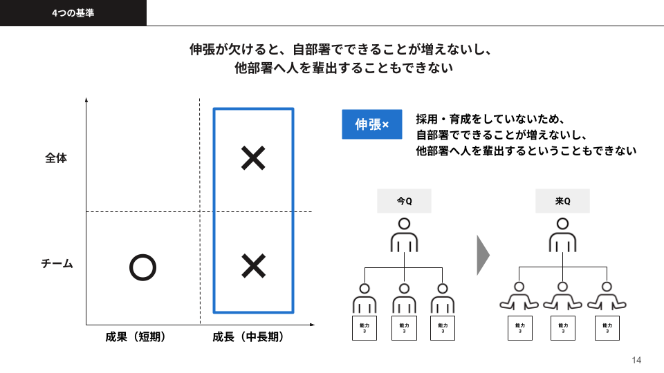 3つ目に「伸張」というのがありました。育成とか採用でチームをどんどん大きくしていく、できることも増やしていくことで、中長期的な右側の軸に行くんですけれども、もし伸張ができていないと、両方とも貢献できませんね。