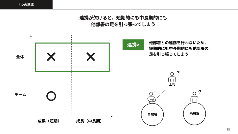 最後に「連携」ですね。言わずもがなですが、連携ができていなければ、短期的にも中長期的に他部署や経営チームの足を引っ張ってしまいます。