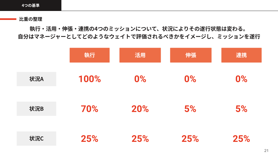 状況に応じて、その遂行状況を見極め、チームや上層部とも目線を合わせておくことも、マネージャーの仕事の一つだと言えます。