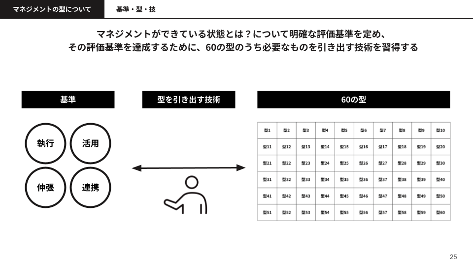その後、株式会社EVeMに入社し、マネジメントの基準を学ぶようになりました。こうした経験もふまえて、今回は、私が学んだマネジメントの4つの基準についてお話ししたいと思います。