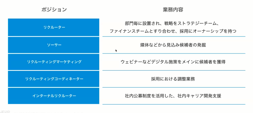 この中でもっとも多いのは私たちリクルーターです。一人ひとりが四半期ごとで定められた採用目標を達成すべく活動をしています。また「ソーサー」は各採用媒体から見込み候補者を発掘します。リクルーティングチームの中のインサイドセールスのような役割です。加えて現在力を入れているのが社内キャリア開発の「インターナルリクルーター」。こちらは社員が自分の意志でキャリアを開拓する社内公募制度を促進するリクルーターになります。